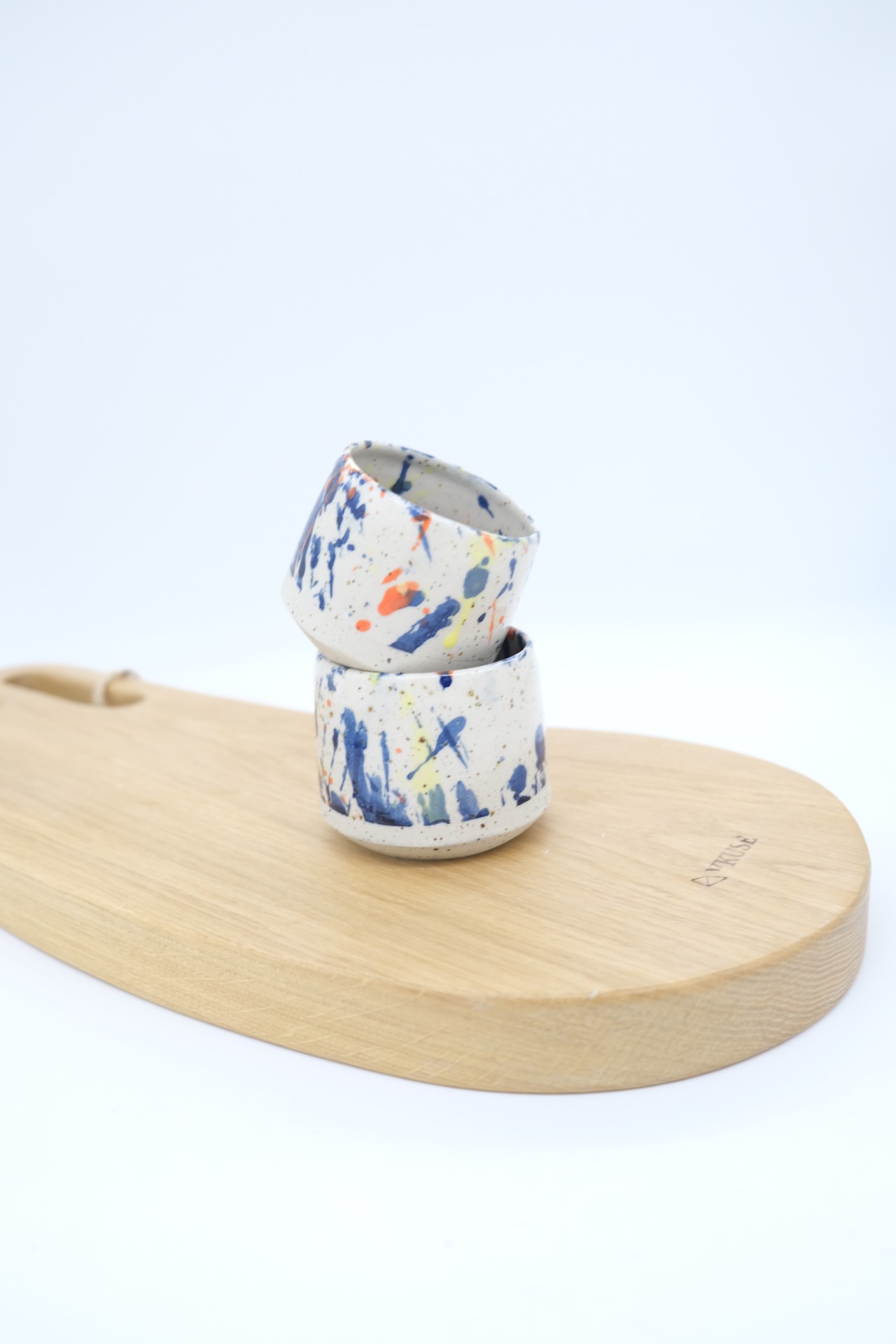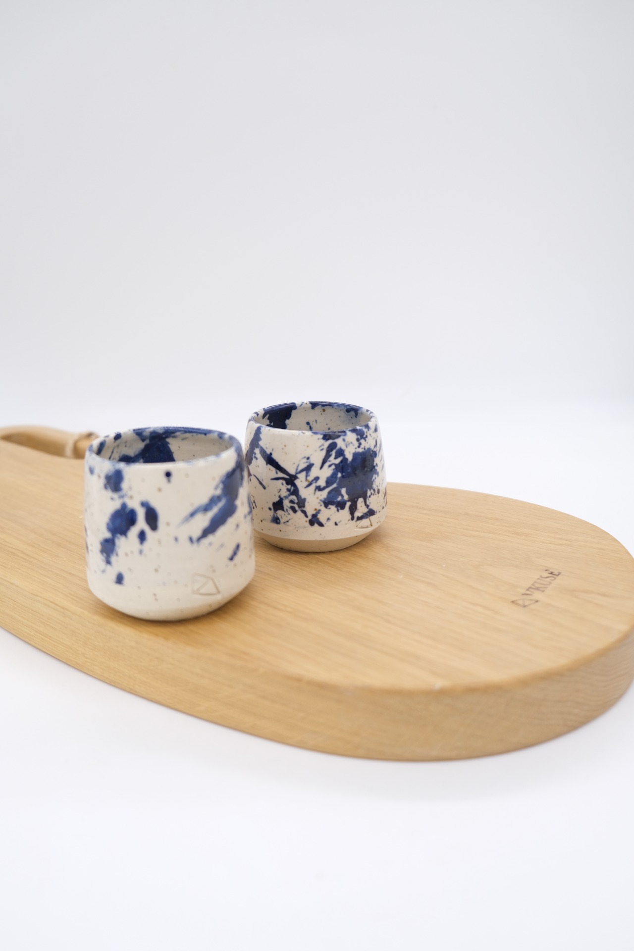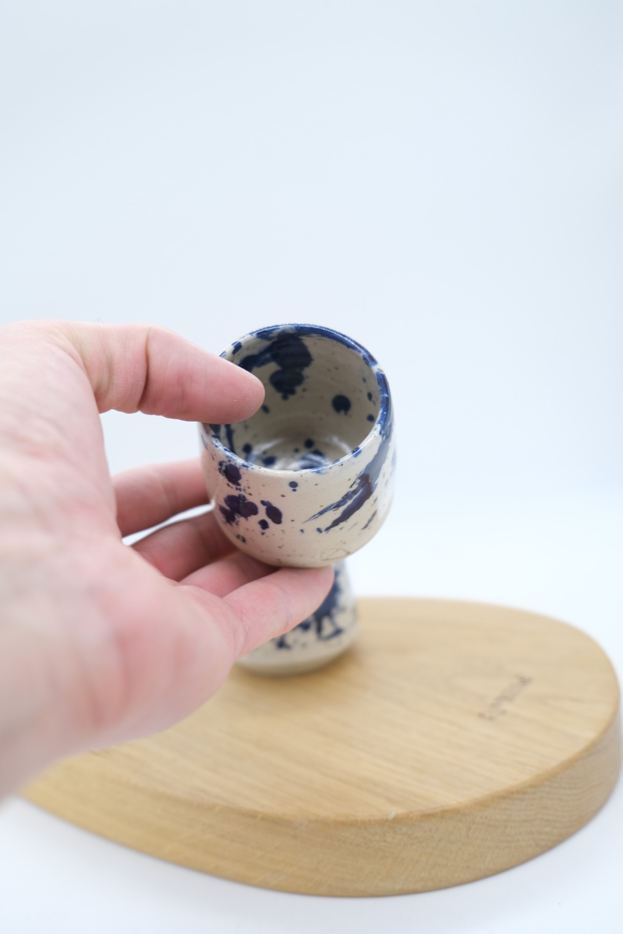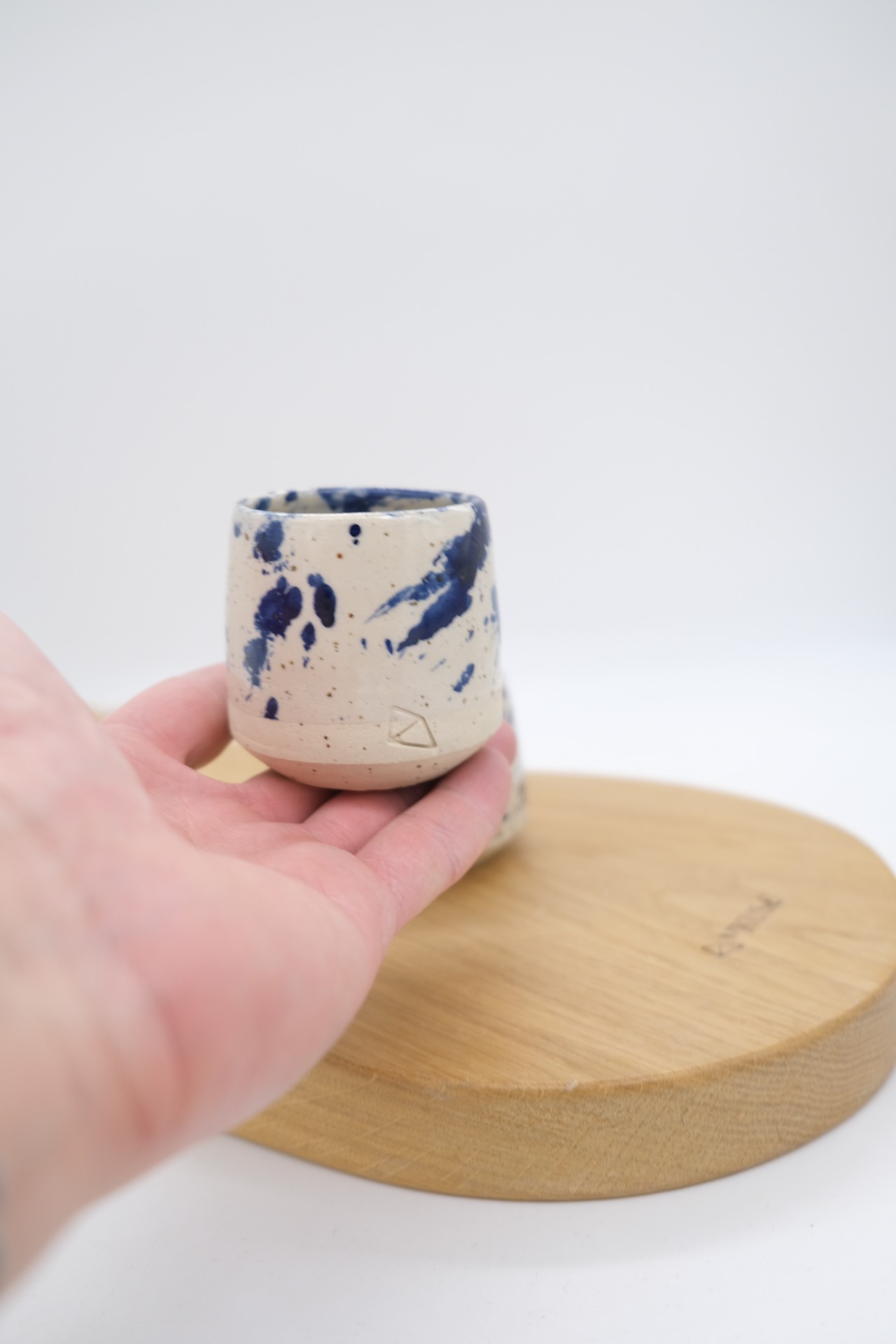 Kalíšek na kávu nebo čaj ze světlé tečkované pálené keramické hlíny s modrým kobaltovým tahem v transparentní glazuře.